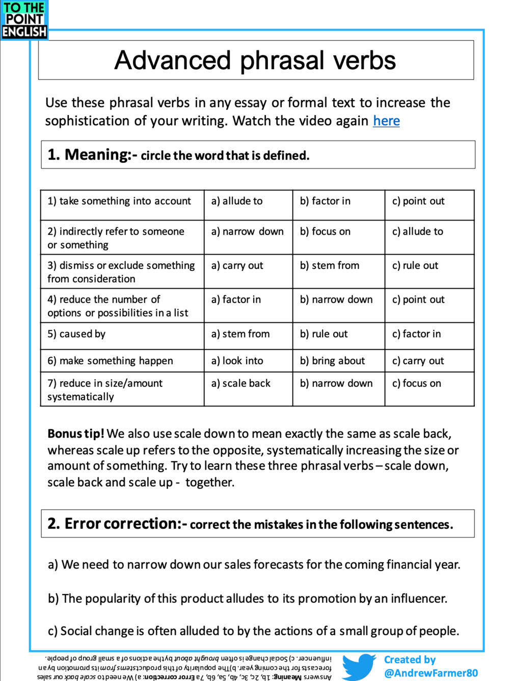 This worksheet will help you ensure you know the meaning of these phrasal verbs and be able to use them accurately in different tenses and voices.